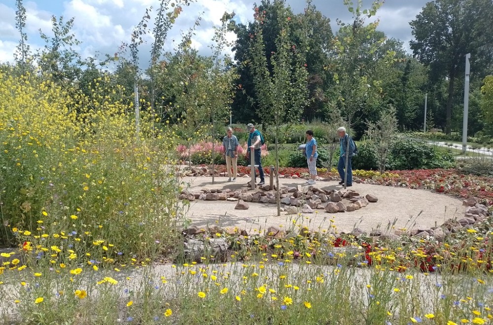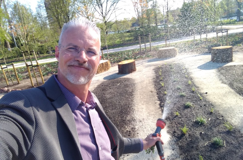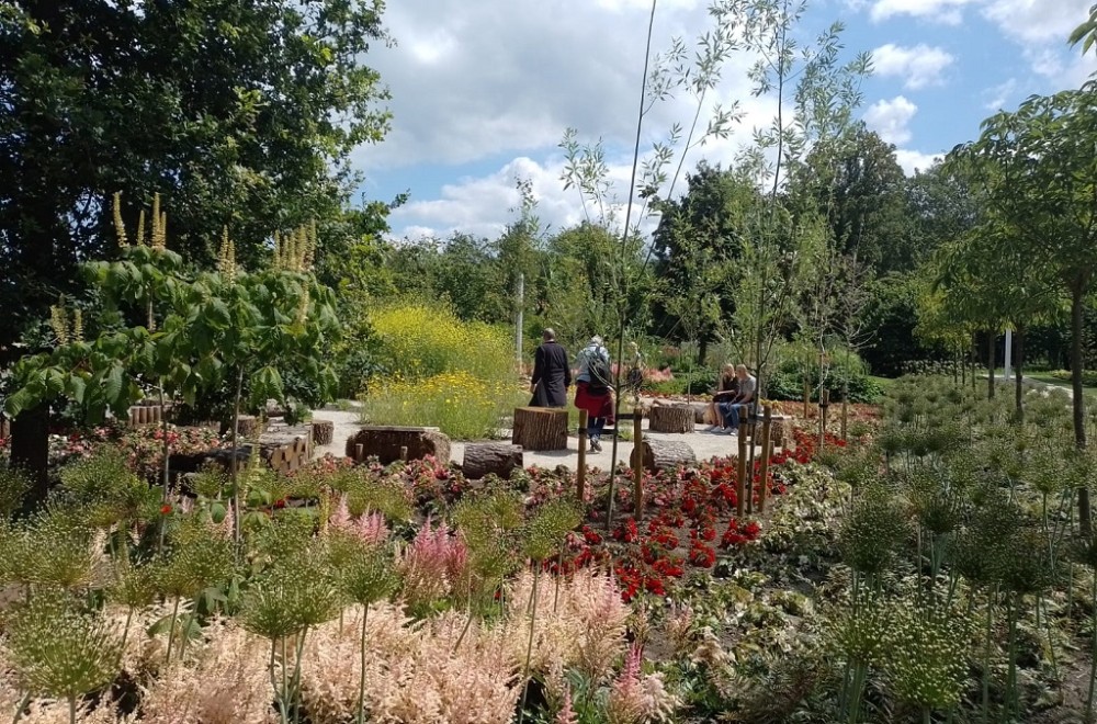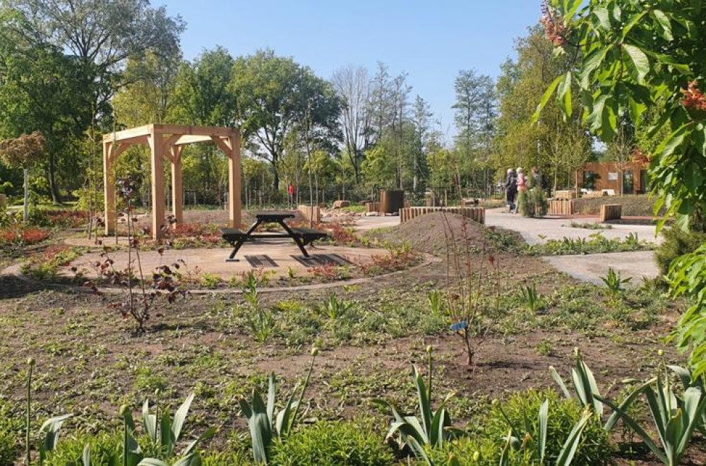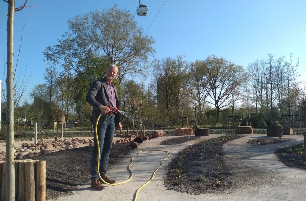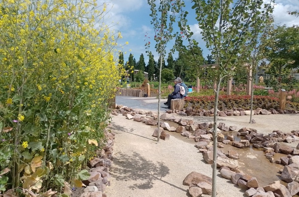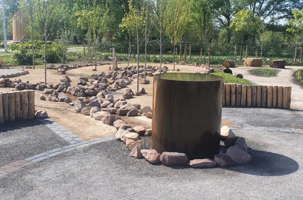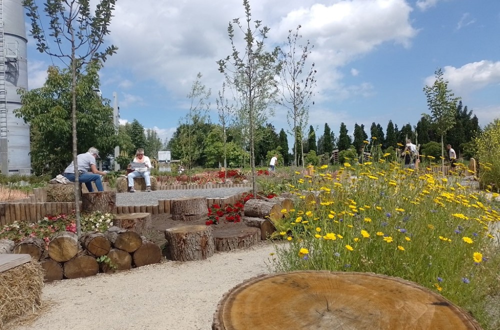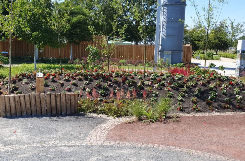 Einen Monat nach der Eröffnung im April hat sich das Grundstück in ein frisches Grün verwandelt. Nach häufigem Gießen wachsen und gedeihen die gepflanzten Bäume und Pflanzen nun. Und das Ergebnis sind wunderschöne Bilder! Jetzt lohnt es sich, das Grundstück zu besuchen und sich inspirieren zu lassen, z. B. für einen naturnahen Garten oder als nachhaltige Anwendung im öffentlichen Raum.