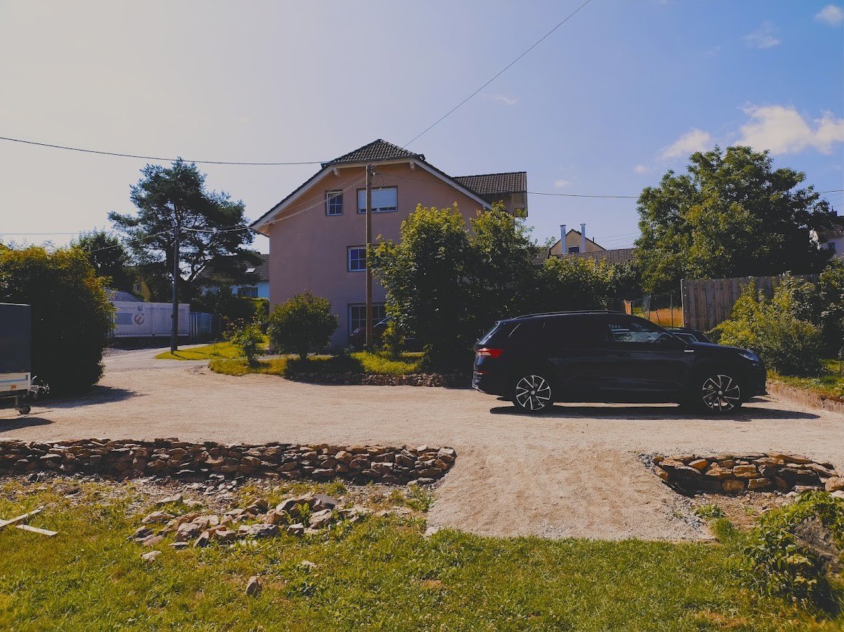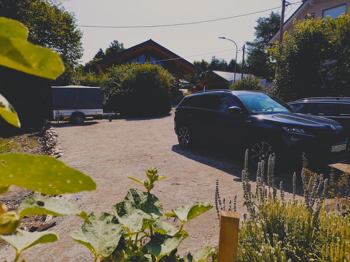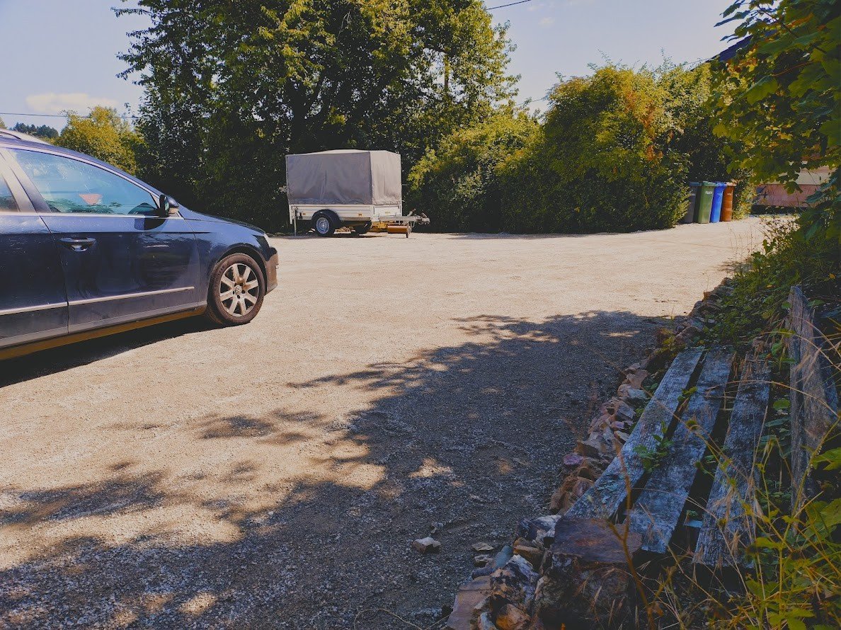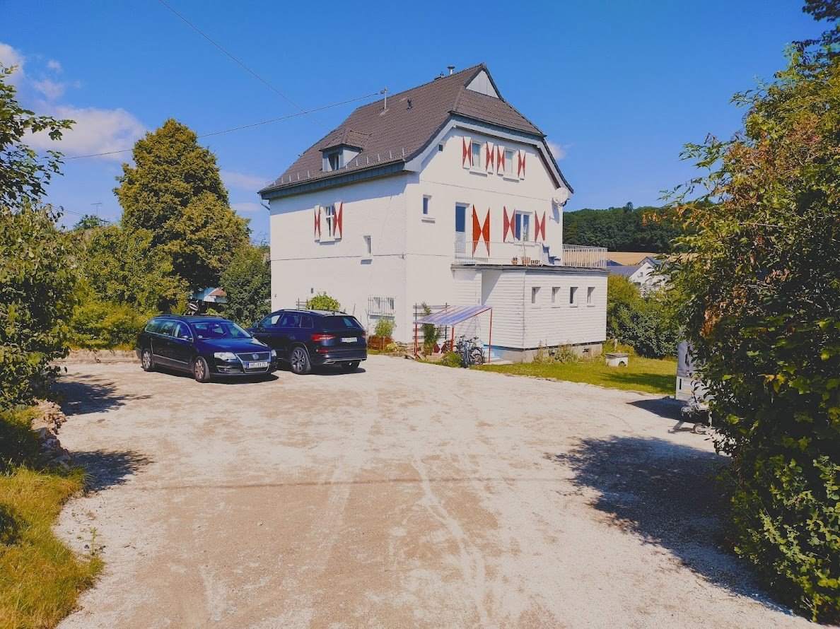 Het huis, een voormalige dorpsschool aan de rand van het dorp, biedt een prachtig uitzicht op het bos. Het werd meer dan 100 jaar geleden gebouwd op een groot perceel op een helling. De oude lerarenkamer fungeert nu als AirBNB. Gasten parkeren direct bij het huis op de circa 270 m² grote parkeerplaats, waar in juni 2025 de KoMex BIO-toplaag werd aangebracht.