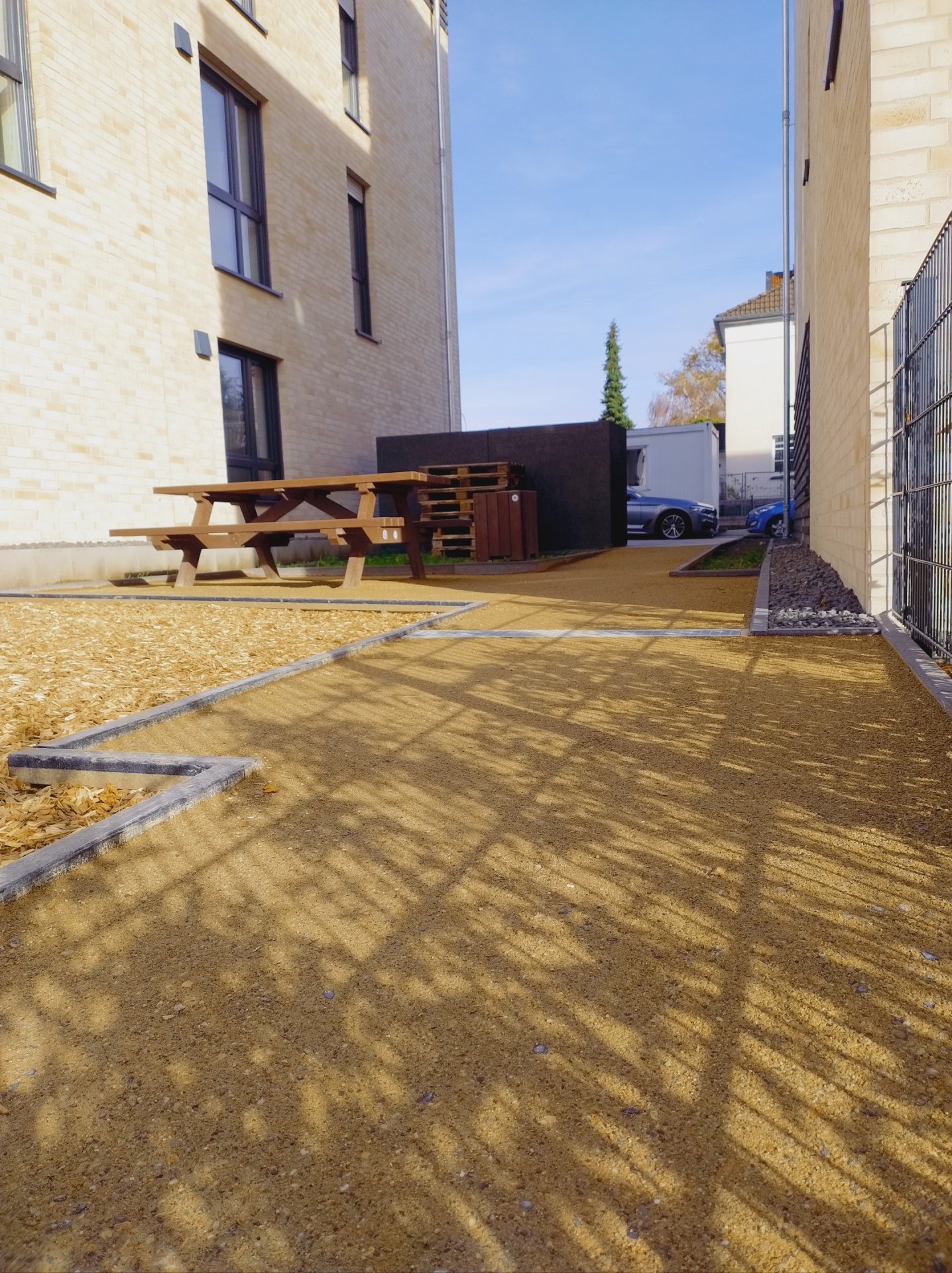 À l’automne 2025, l’entreprise Galabau Rainer Eschbach de Much a appliqué des couches de surface en Koers KoMex Jaune sur plusieurs petites aires de jeux et allées piétonnes dans le nouveau quartier résidentiel de la Uferstraße à Leichlingen. Le quartier comprend 69 nouveaux appartements en copropriété répartis sur cinq bâtiments, à seulement quelques centaines de mètres de la Wupper et du centre-ville.