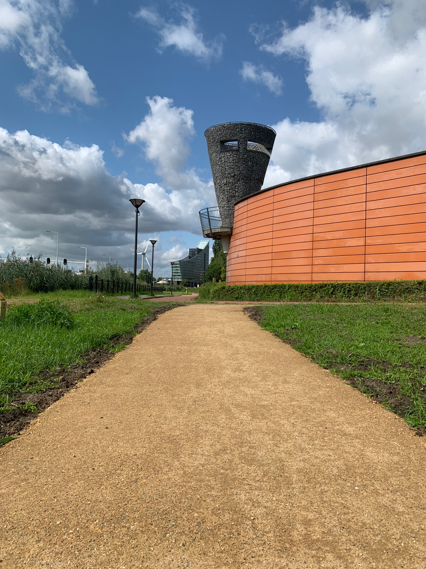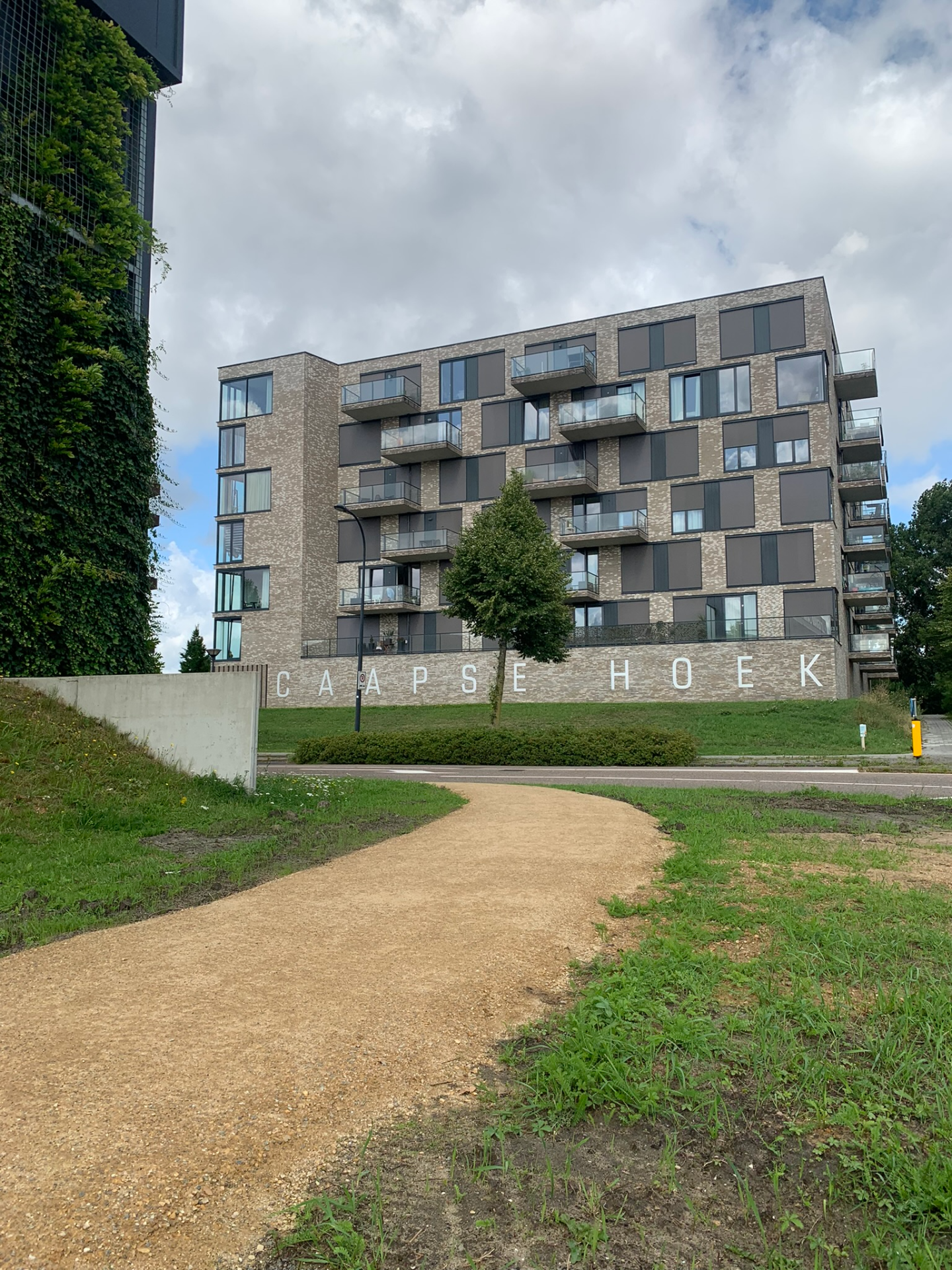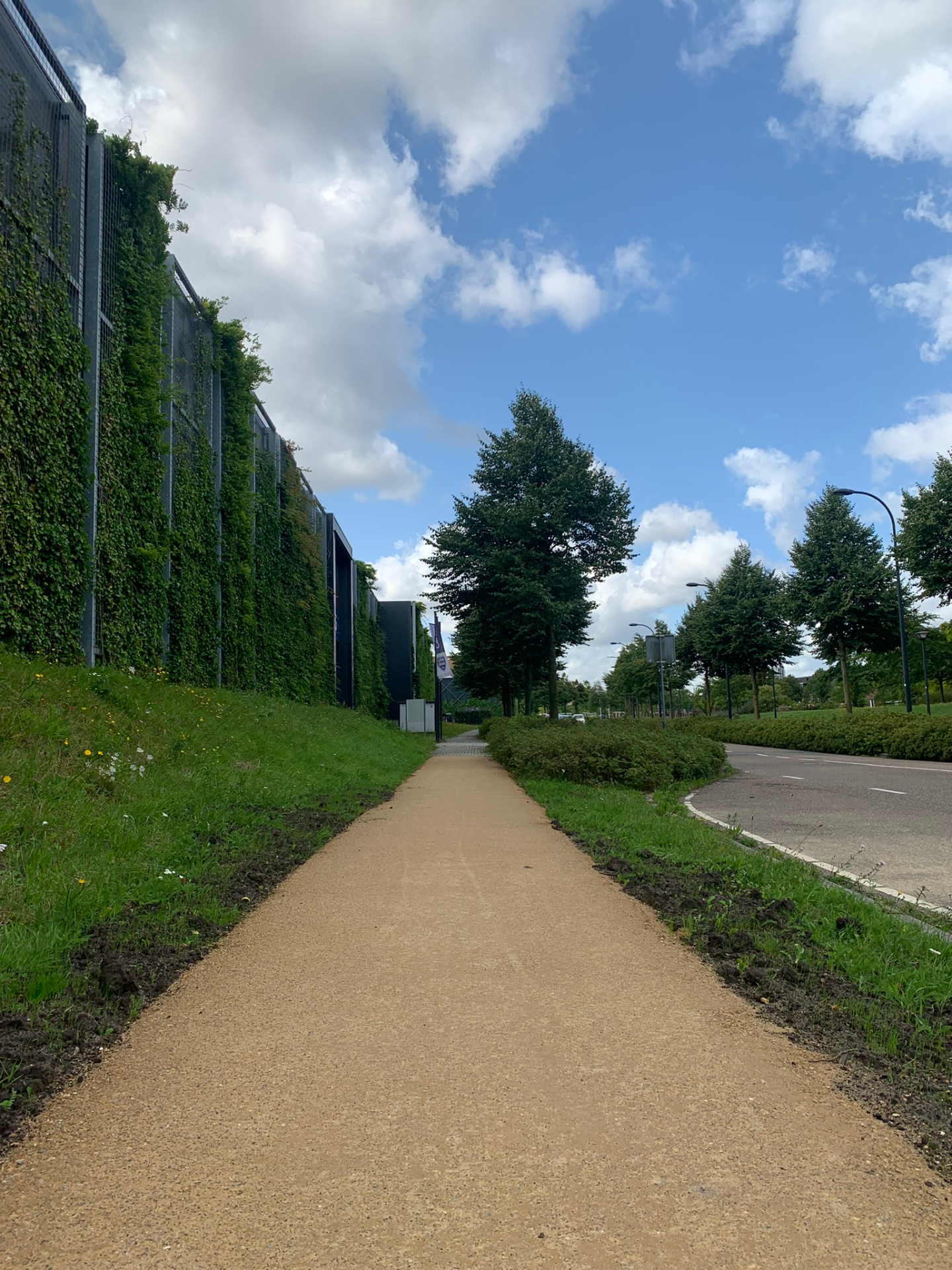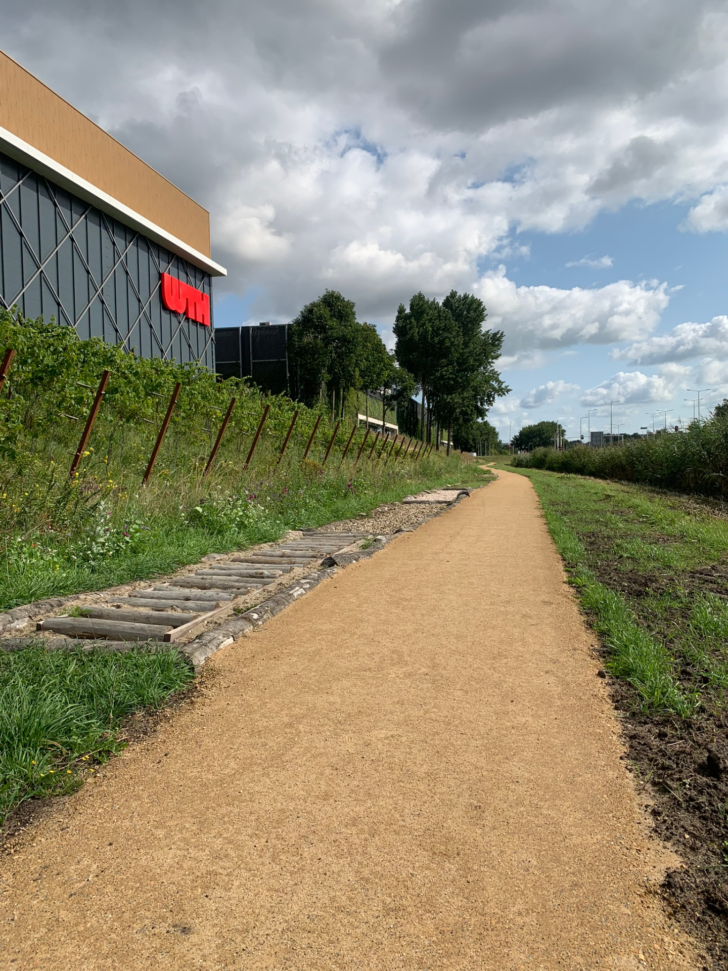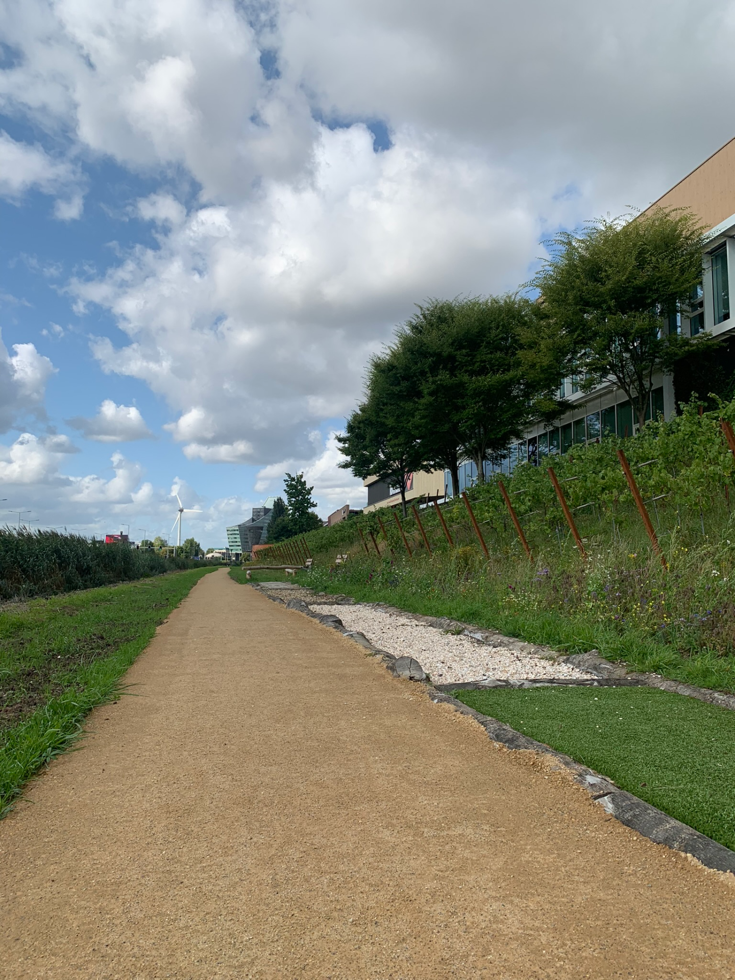 Achter de gebouwen/kantoren slingert een zorgvuldig aangelegd pad, omringd door weelderig groen dat in elk seizoen een andere sfeer neerzet. Aan de rand van het wandelpad ligt zelfs een kleine stadswijngaard, een onverwachte oase die het gebied een bijna mediterrane charme geeft. Het is een plek die uitnodigt om tijdens een pauze even naar buiten te gaan, een frisse neus te halen en in alle rust te wandelen.